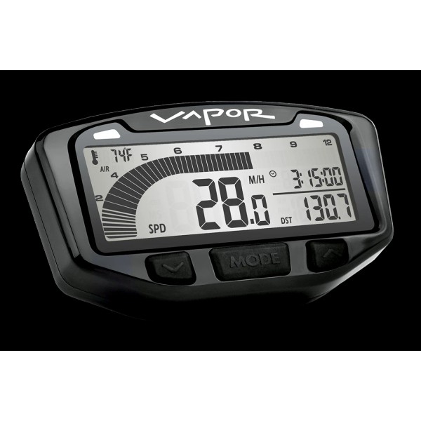 - Vapor displays speed, teach, engine temperature, ambient temperature, resettable distance, clock, ride time, and odometer