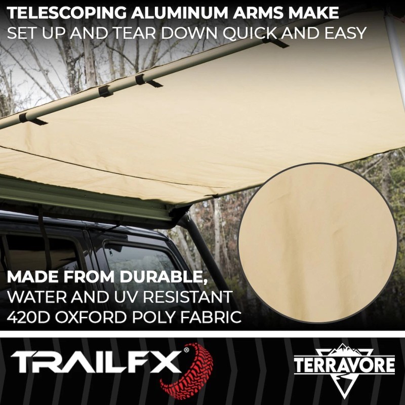 Terravore awnings by TrailFX create the perfect place to get out of the sun or rain when recreating outside with your vehicle. Whether you are camping, tailgating or just enjoying an outdoor event, the durable, UV resistant and waterproof 420D Oxford Poly canopy will help keep you cool and dry. Side walls are available to create a complete enclosure (sold separately). The twist-lock, telescoping poles smoothly extend and retract to make set up and take down a breeze. Ground stakes and tension rope are included. The awning conveniently stores in a self-contained, heavy-duty PVC cover and mounts to most roof racks, cargo baskets and flat surfaces.