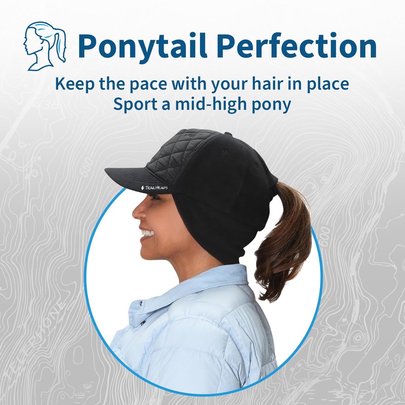 TrailHeads Women's Winter Ponytail Hat | Trucker Hat with Drop Down Ear Warmers | Quilted Hat - Black