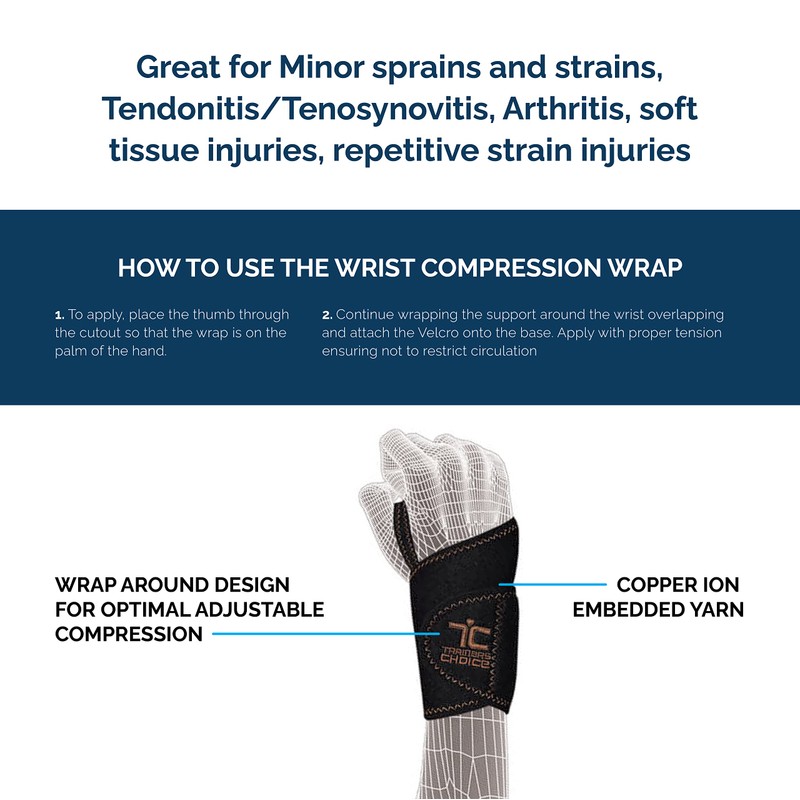 - Wrist Compression Support: Trainers Choice copper wrist compression wrap helps with minor sprains, repetitive strain injuries, tenosynovitis, arthritis and tendonitis.