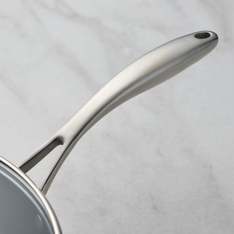 - Heat- and shatter-resistant tempered glass lid with wide stainless steel rim