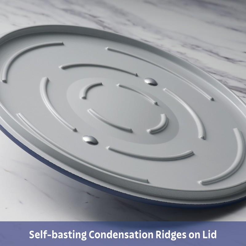 - Self-basting Lid: Aluminum alloy lid with self-basting condensation ridges.