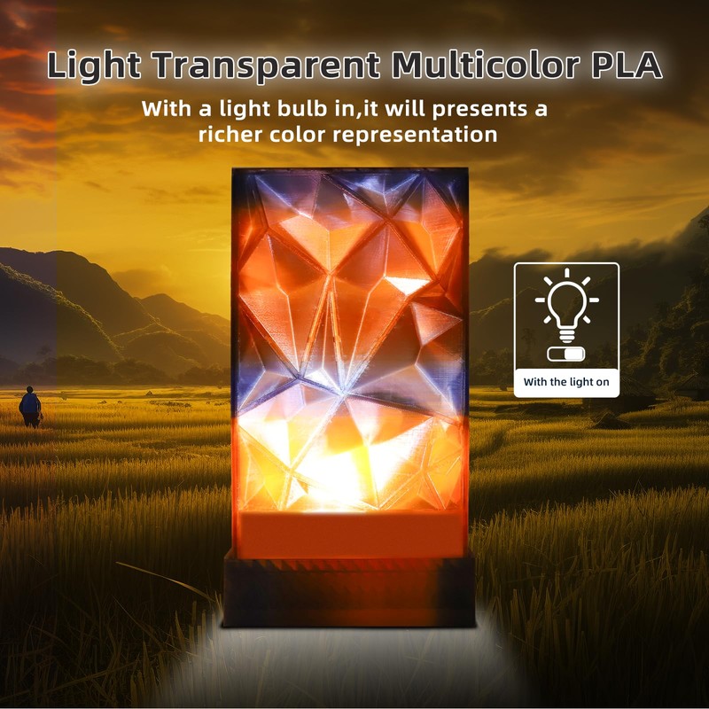 - Multicolor transparent PLA Filament: Multicolor color changing mixed in one spool filament and presents a rich visual aesthetic. You just need print about 100g and it shows all colors.