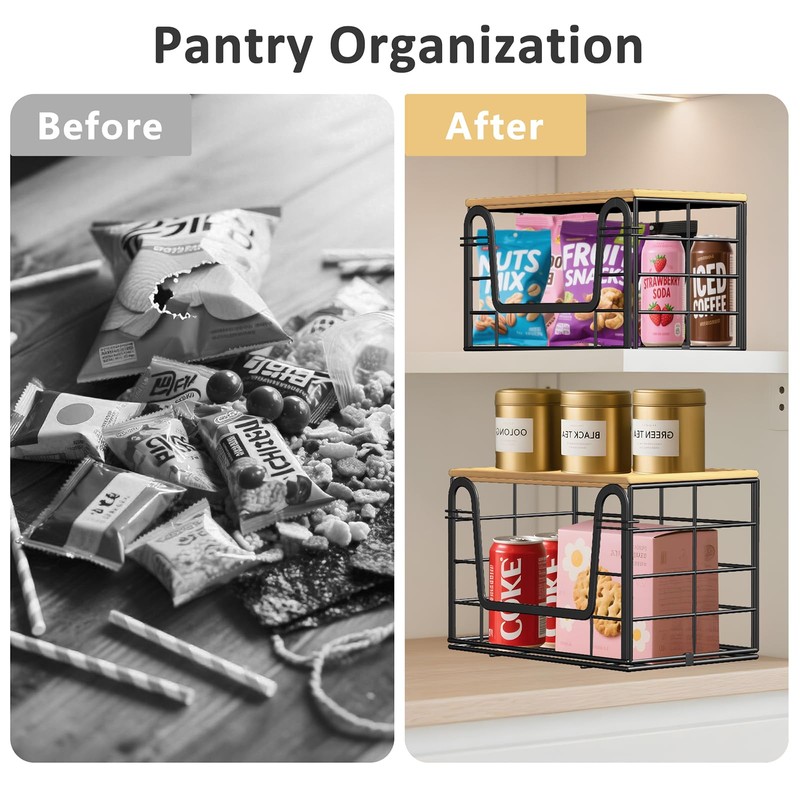 Wide front opening for easy access; stackable vertically to save room. Top comes with a natural bamboo lid—adds style anddoubles as extra storage (snacks, potatoes, odds & ends!).