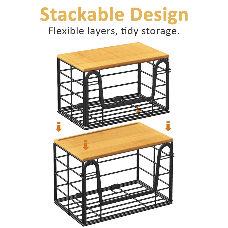 - Space Saving: The front features a wide opening, making item access even more convenient. Its stackable design maximizes vertical space utilization. The top is paired with a bamboo lid that not only enhances the overall aesthetic but also serves as additional storage space. Whether used for trash bag storage or general organization, it keeps kitchens/cabinets neat and organized, effortlessly achieving efficient space utilization