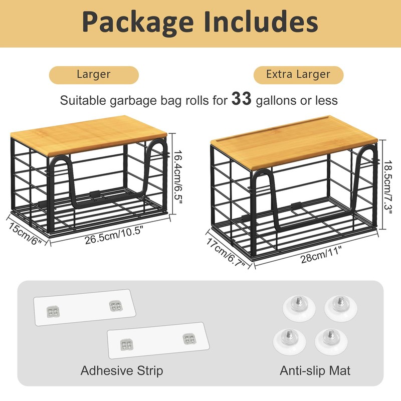 - Extra Large Capacity: This large trash bag holder dispenser is designed to hold most standard and large roll-style trash bags. It accommodates both 13-33 gallon large-capacity standard sizes and 4-10 gallon small-sized household trash bag options, meeting daily storage needs for kitchens and laundry rooms, making it a must-have for any home