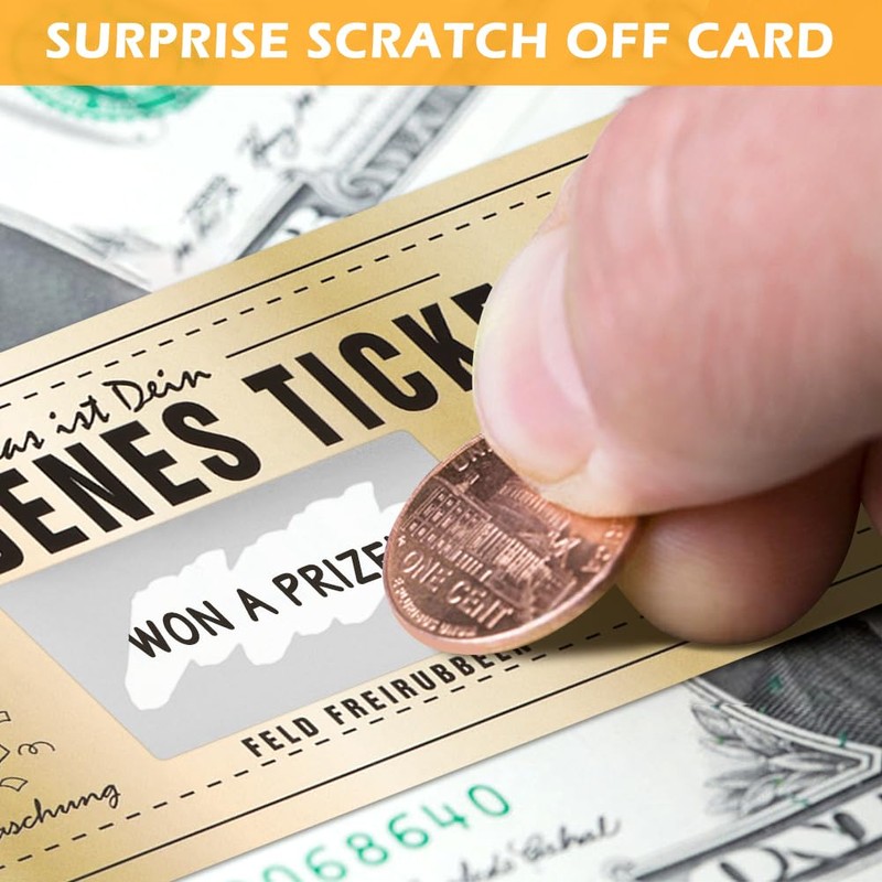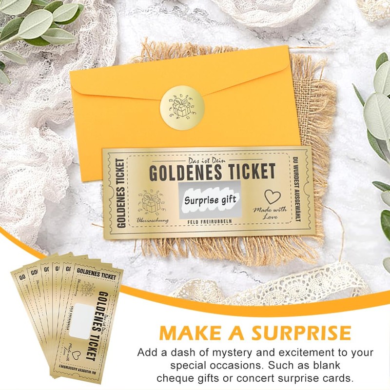 - 【FOR DIY】Fill in the secret surprise gift and cover with the included large scratch-off rectangular gold sticker. You can handwrite your surprise and stick the scratch-off sticker over your writing.Comes with a plain white ticket. Can be left as is or use this space to write a special message.