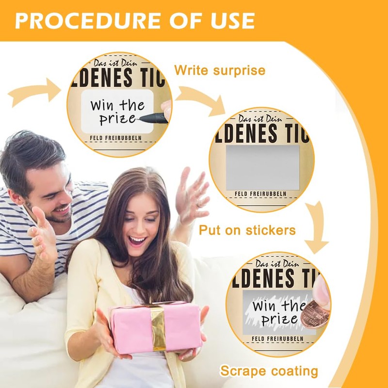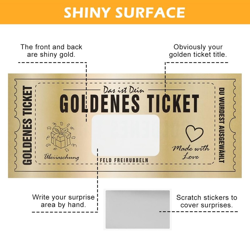 【FOR DIY】Fill in the secret surprise gift and cover with the included large scratch-off rectangular gold sticker. You can handwrite your surprise and stick the scratch-off sticker over your writing.Comes with a plain white ticket. Can be left as is or use this space to write a special message.