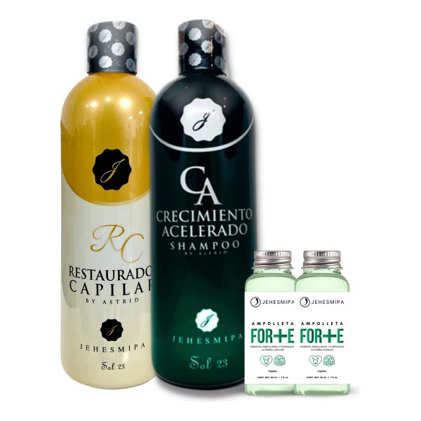 FORMA DE USO: Shampoo Crecimiento Acelerado: Aplicación todos los dias 5 minutos durante la ducha, con un suave masaje. No funciona en alopecia o problemas hormonales. Restaurador: Tratamiento sellador para cabello, enriquecido con colágeno, ceramidas y proteína natural, además de una molécula activadora del agua que se adhiere al cabello cuando la evaporación ocurre. Sella la cutícula mientras consolida una capa protectora sobre el cabello.