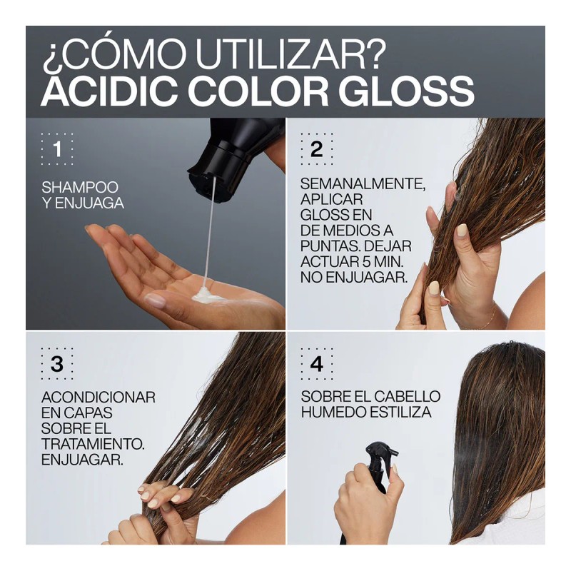 Modo de uso: Después de lavar y acondicionar el cabello (idealmente con el shampoo y acondicionador de la línea Acidic Color Gloss), retira el exceso de humedad con una toalla. Aplica una pequeña cantidad del tratamiento sin enjuague desde medios hasta puntas. Distribuye uniformemente. No enjuagues. Procede a peinar y estilizar como de costumbre. ¡Disfruta de un color vibrante y un brillo deslumbrante cada día! 👑