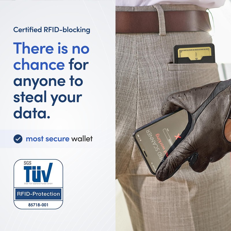 - ???? ???????? - The RFID blocking function of our front pocket wallet has been certified by the independent institute TV Germany for completely blocking the RFID frequency 13.56 MHz. This protects your cards in the aluminum frame and also the front pocket from being read