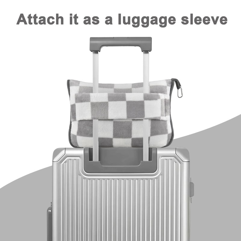 Travel Blanket and Pillow Compact, Premium Soft 2 in 1 Airplane Blanket with Soft Bag Pillowcase,Hand Luggage Sleeve and Backpack Clip (Grey Checkered)