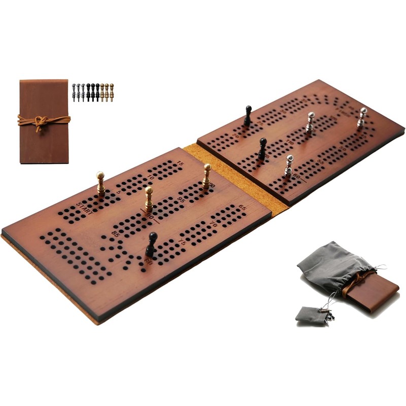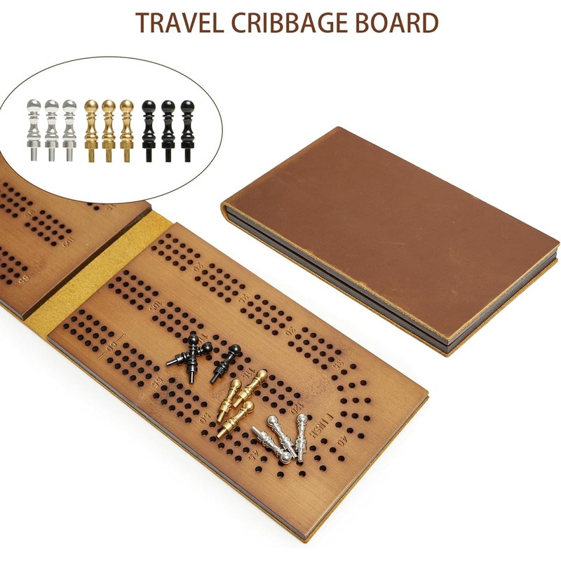 Travel Cribbage Board Game Leather & Solid Bambo-Wood Pocket Sized Tiny Card Game Board