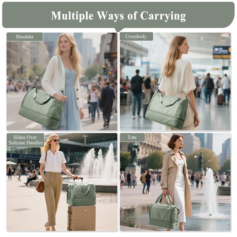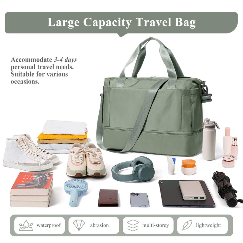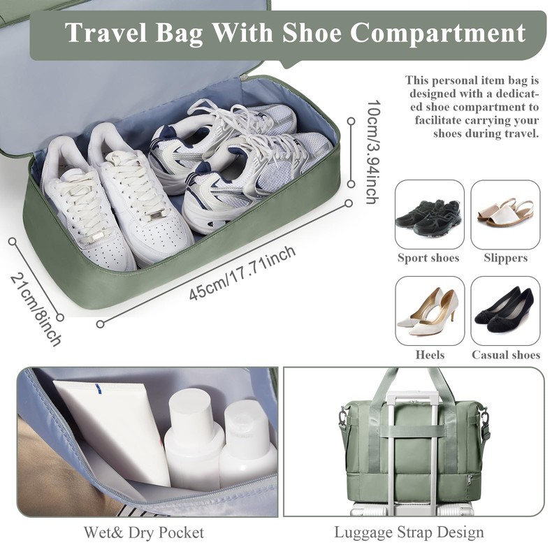 Travel Duffel Bag with Shoes Compartment, Overnight Weekender Bags for Women, Carry on Personal Item Bag with Wet Pocket for Travel, Gym, Weekend,Green