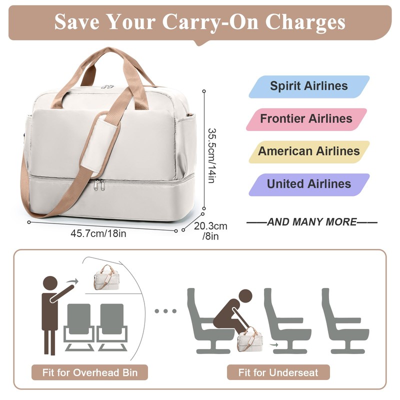 - Meet the Standards for Air Travel: The travel bag size design of 18 x 14 x 8 inches meets the personal item size requirements of Spirit Airlines & Frontier, which can fit in the overhead compartment in flight,or under the seat during the flight. Using this personal item travel bag can save your carry-on charges