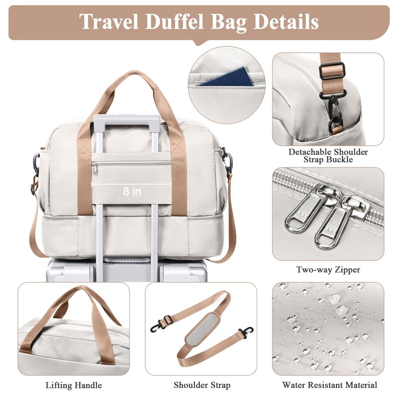 - Dry Wet Separate & Luggage Sleeve: This travel bag is designed with a practical dry-wet separation feature, allowing you to neatly organize your belongings by keeping wet items, such as toiletries or swimwear, separated from dry clean clothes. And it's luggage sleeve design that enables you to effortlessly slide the bag over the handle of your rolling suitcase. making your journey through airports, train stations, or busy streets more comfortable and hassle-free