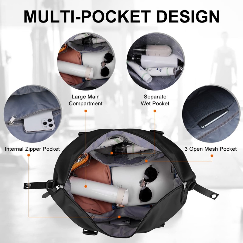 - ✈【Gym Bag with Wet Pocket】 The sports gym bag is equipped with a dry and wet separation pocket.High density waterproof material can help you distinguish between dry and wet items. It is for storing wet clothes, towels, or bathing suits after you exercise or change clothes, for bottles, umbrellas, shampoo, body wash, and facial cleanser, and best for your sporting or traveling necessities.