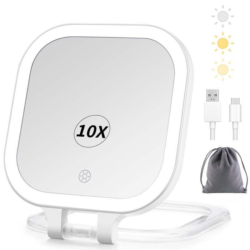 Travel Magnifying Makeup Mirror with Lights 1X/10X, Rechargeable Double Sided Lighted Makeup Mirror with Magnification, LED Vanity Table Hand Held Hanging Portable Desk Foldable Light Up Mirror