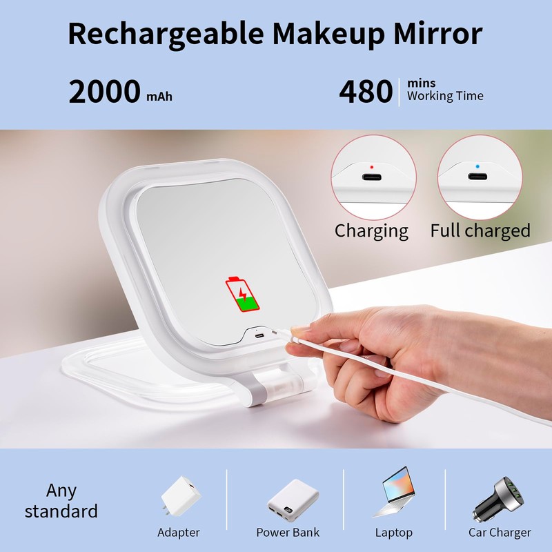 - Built-in 2000mAh Rechargeable Battery: The LED travel makeup mirror has built-in 72 high-brightness LED lamp beads, which are very durable and have a service life of up to 50,000 hours. Built-in 2000mah battery, which can be fully charged in two hours, and can be used wirelessly for 4-8 hours continuously after being fully charged