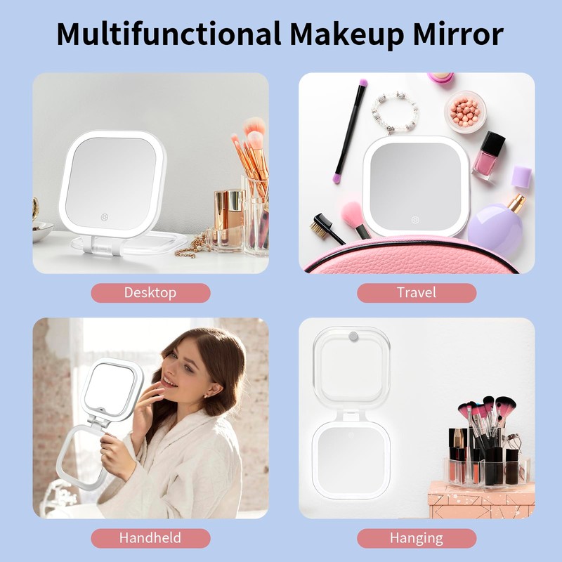 - Portable Folding Lighted Mirror: This travel lighted makeup mirror is 7.09*8.11 inches long and only 0.83 inches thick when folded. The compact design takes up very little space and is very suitable for travel or daily use. The bracket on the bottom allows the mirror to stand stably on the countertop, preventing the light up travel magnifying mirror from slipping or falling during use. The white exterior and transparent base can be placed in harmony with any scene. It is not only a professional magnifying travel makeup mirror with lights that can be used in home, bathroom, hotel, etc., but also a desk lamp, night light, atmosphere light and more