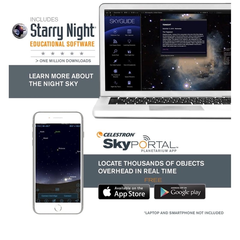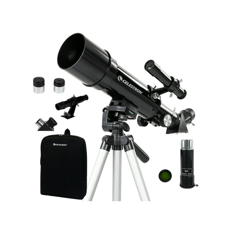 Get a new perspective on nature and the Universe with the ideal day-to-night telescope, Travel Scope 60. The Travel Scope 60 is a refractor telescope perfect for terrestrial and celestial viewing on the go. The Travel Scope can view the planets, moon, star clusters and brighter deep sky objects like the Orion Nebula and Andromeda Galaxy at night and with the erect image star diagonal makes the optical tube ideal for using as a spotting scope during the day. Setting up the telescope is a breeze and will have you observing in no time. Even on your first time out, you can assemble the telescope and its accessories in just a few minutes. The adjustable tripod legs allow you to customize the telescope’s height or place it on raised surfaces like a picnic table. The total telescope kit weighs in at just 3.3 pounds—perfect for impromptu observing sessions or transporting wherever life’s adventures take you. Manual Alt-Azimuth telescope Navigate the sky with a pan handle Alt-Az control with clutch for smooth and accurate pointing. Move the clutch in an up/down, left/right fashion to track your object in the eyepiece. Accessories Included The Travel Scope 60 comes with two eyepieces (20mm and 8mm), a 45° erect image diagonal, a 3x Barlow lens, a 5x20 finderscope, a Moon filter, and a travel backpack. The two eyepieces offer different magnifications to view your intended object. The erect image diagonal allows for right-side-up viewing ideal for terrestrial subjects but can also be used for celestial objects. The 5x20 finderscope will help you quickly center an object in your eyepiece for easier observing. Connect the 3x Barlow lens to your eyepieces to boost your magnification by a factor of three. Paired with the included eyepieces, the Barlow delivers 54x and 135x magnification for up-close views. Moon Filter– Enjoy the details of the Moon without the brightness. It only takes a second or two to transform your regular eyepiece into one suited for lunar observations—simply thread this filter onto the bottom of your eyepieces. The Moon Filter is also helpful when observing Venus or bright terrestrial scenes to reduce glare. Travel Backpack –A custom backpack comes with your telescope, giving you a safe place to store your optical tube, tripod, eyepieces and accessories comfortably. This backpack also makes traveling with your telescope is a breeze. All the components fit inside of the backpack with room for you to add other accessories later. Starry Night Software Download Celestron’s Starry Night Software and learn about the night sky, celestial objects, and how to plan your next observing session. Celestron Starry Night Software is the premier astronomy software package on the market, providing resources and knowledge to view our solar system and beyond.