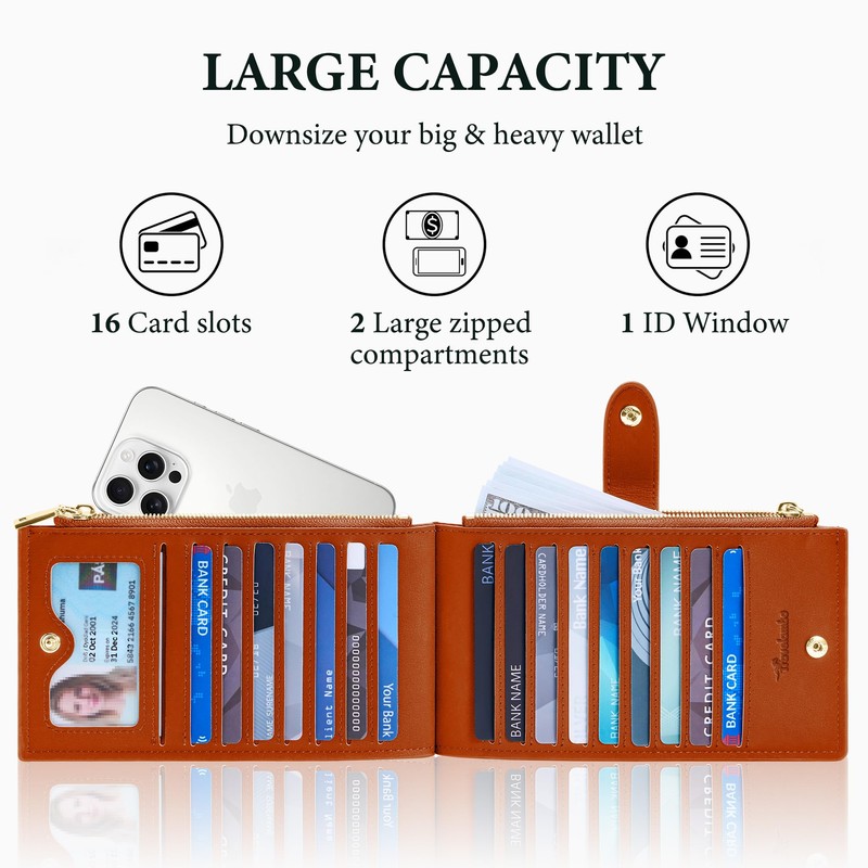 • Slim & Functionality: This slim wallet for women features 16 card slots and 2 zippered compartments for cash, coins. With its thin design and a snap buckle, it is perfect for organizing all your personal essentials. It can fit plenty of cards, cash, checks, receipts, passport etc without being bulky