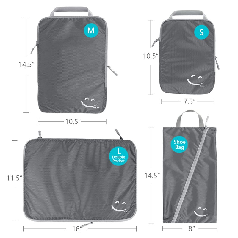 • COMPRESSION BAGS WITH MULTI-FUNCTIONAL AND MULTI-SIZES:4 Set Packing Cubes: SIZE S : 10 x 7.5 Inches ,SIZE M: 14.5 x 10.5 Inches ,SIZE L: 16" x 11.5 Inches,Shoe bag: 14.5x 8 Inches. These Storage Bags are suitable for various scenes,traveling,camping,Business trip,Home storage,etc.
