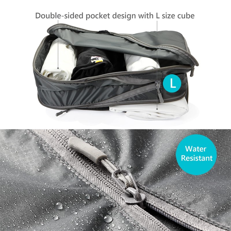 • COMPRESSION PACKING BAGS WITH INNOVATIVE DESIGN:The packing cube helps you pack your clothes for the upcoming trip. They save space for you by compressing your clothes together. The Large expandable cube uses two zipper systems to help eliminate the extra volume when packing luggage. The front of our product is translucent, so you can distinguish what's in it without opening it, which can help you save time in finding your clothes.