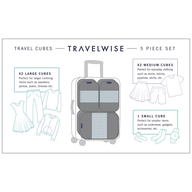 TravelWise Luggage Packing Organization Cubes 5 Pack, Black, 2 Small, 2 Medium, 1 Large