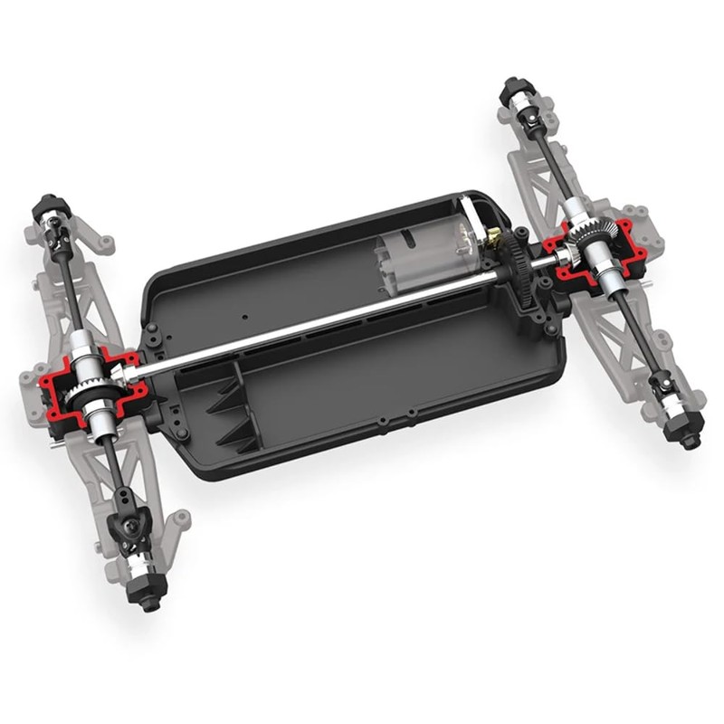 - Features: Chassis: Molded composite nylon monocoque Drive: Shaft, four-wheel drive for maximum traction with an aluminum center driveshaft Transmission: 10T Pinion / 60T Spur gear Radio: 2.4GHz, servo reversing, low battery indicator and electronic steering trim control, with 3-Channel micro receiver fully protected by a patented weather-sealed receiver box Steering servo: Integrated, High torque, waterproof sub micro design Steering: Bellcrank Electronic