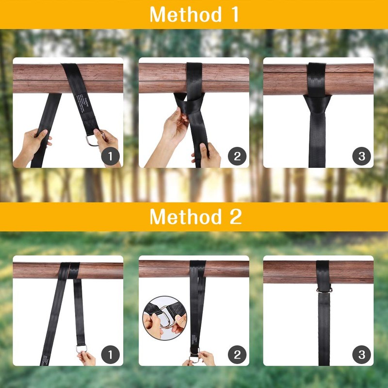 - Easy and quick installation: You can hang the swing within a minute, and no tools are required. Place the strap on the tree; wrap the strap to adjust the correct length; place the strap through the metal ring; hang the swing and check firmness.