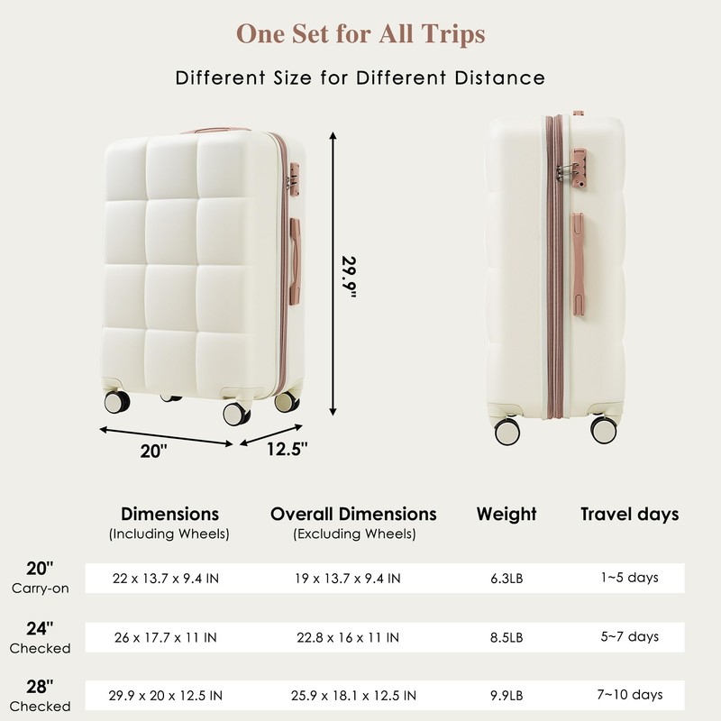 - Expandable Options: The set includes a 20" carry-on suitcase with USB charging ports (power bank not included), and expandable sizes at 24" and 28", enlarging capacity by 25%.