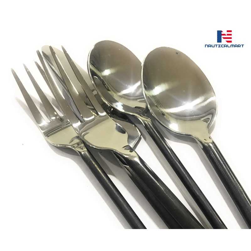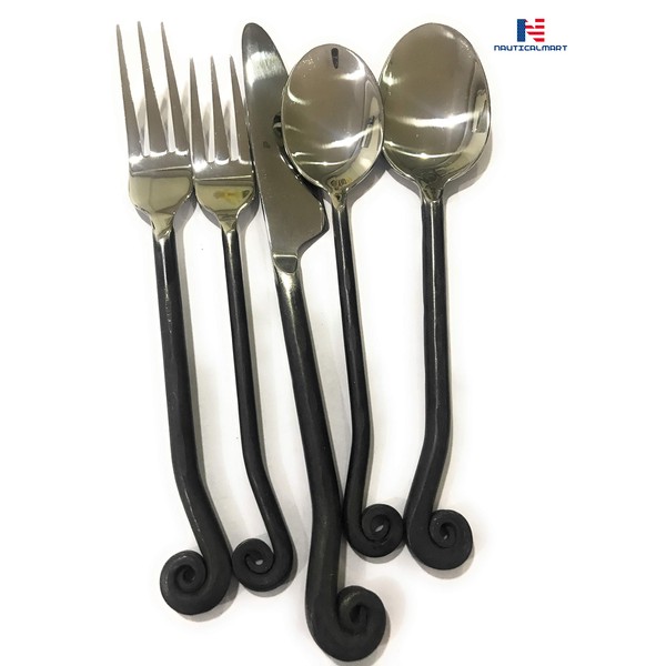 With its natural shaping and distinctive finishes, Treble Clef flatware has an artisanal quality that makes for an intimate, earthy feel at the table. Heat- forged for durability, the pattern features contoured handles that end in a curl reminiscent of the scroll of a violin. The mirror-finish working ends are bright and smooth, while the handles are blackened for a rustic effect. Ideal for casual entertaining, the pattern is also a great daily choice for playful spirits. With 10 pieces in all, this Treble Clef set includes: salad fork, a dinner fork, a knife, a soupspoon, and a teaspoon. Crafted from 18/10 stainless steel, the set is corrosion-resistant, safe in the dishwasher, and designed to keep its finish without polishing. This is handmade medieval style antique cutlery utensil set.