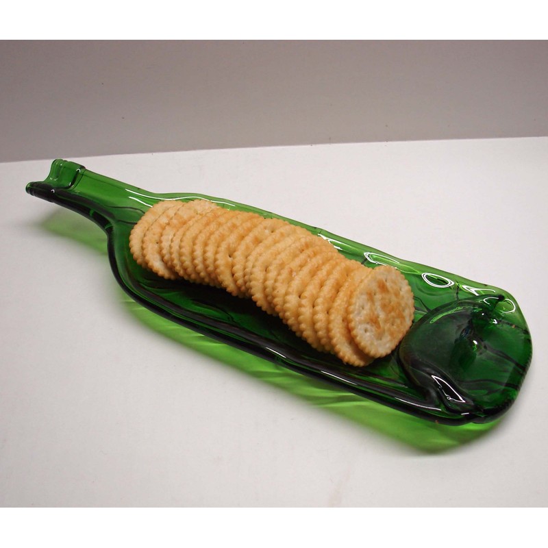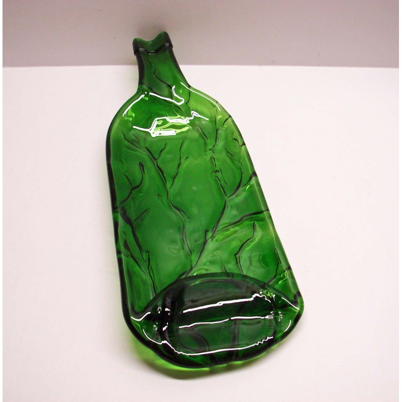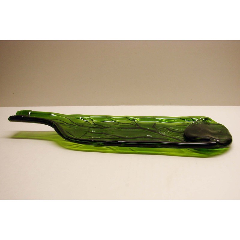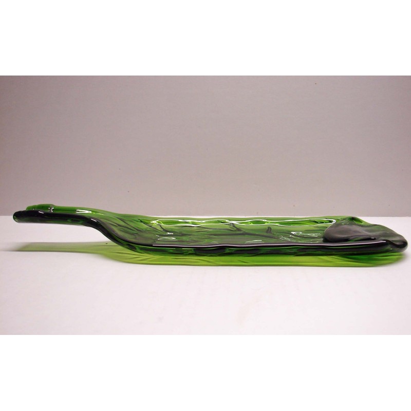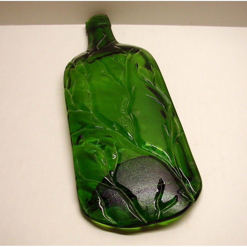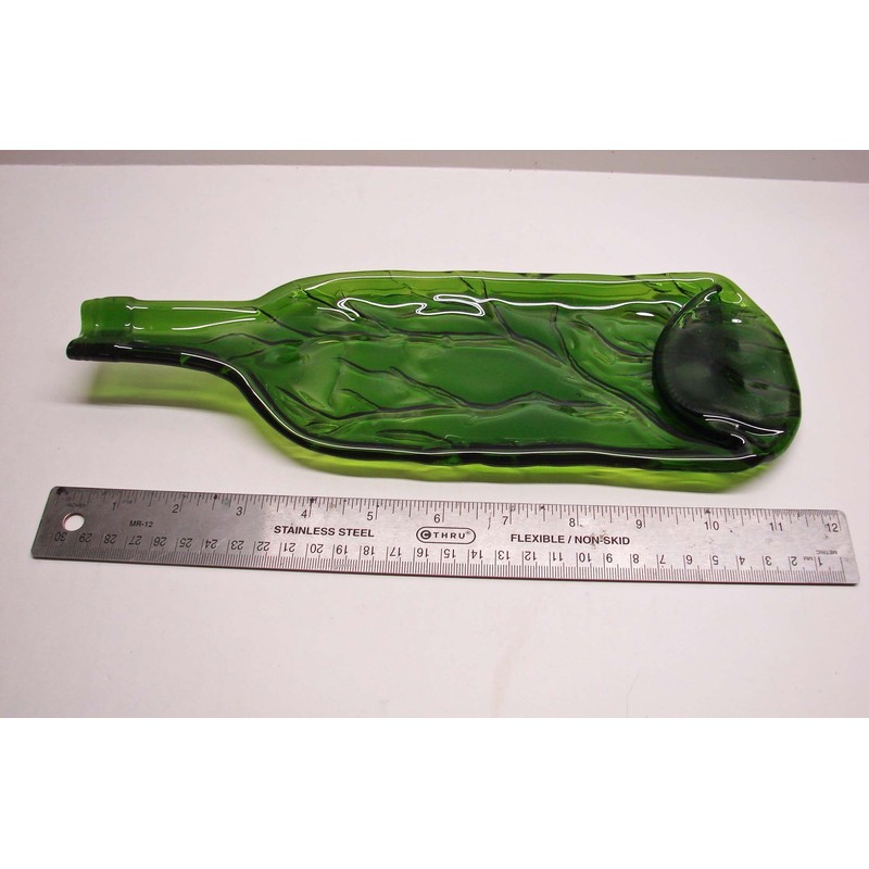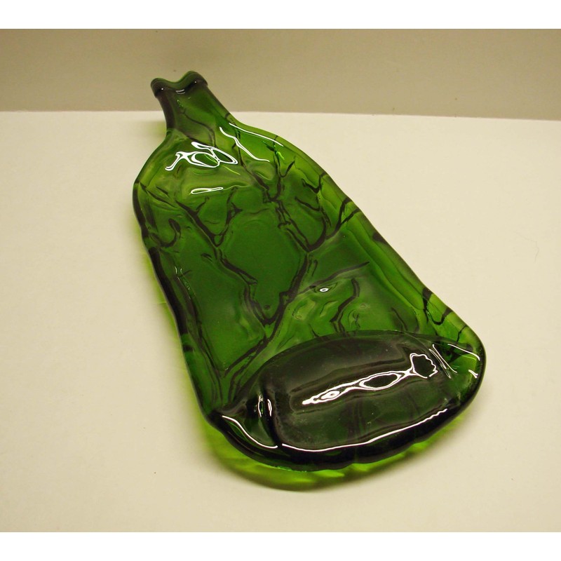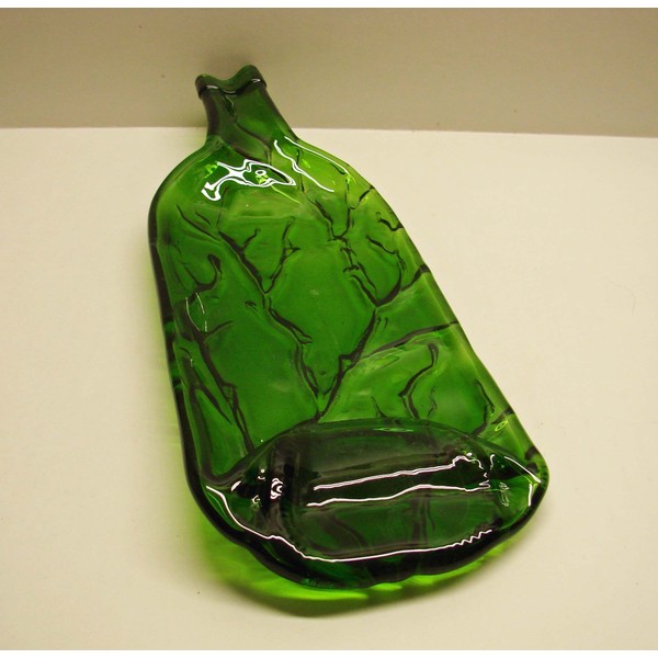 This is a moss green wine bottle that I placed in a mold inside my kiln to give it a slight concave shape and a tree branch design embossed on the back. It can be used as a decorative bowl, serving dish, a large spoon rest, an ashtray, a trinket dish, the possibilities are endless. I offer this design in clear, green and yellow.