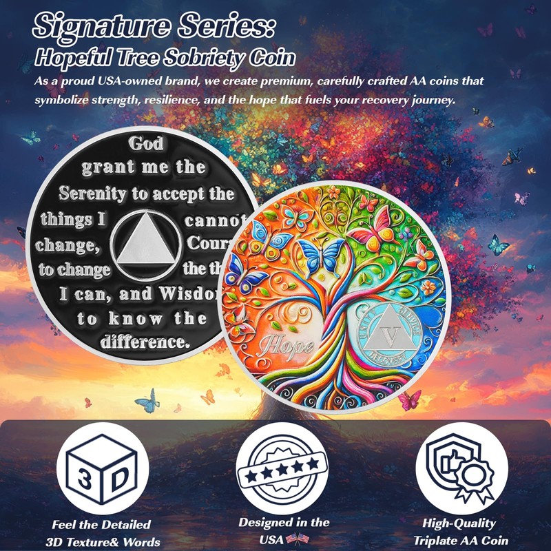 - Inspiring Journey Design: The Hopeful Tree design on the front of the sobriety chip reminds us that recovery is a process of growth, renewal, and transformation. Each butterfly represents personal growth and change, while the tree itself reflects strength, rootedness, and resilience. The words "Hope" and the intricate design highlight the theme of rising above adversity and finding freedom, making this sobriety medallion a beacon of hope and a reminder of the potential for transformation