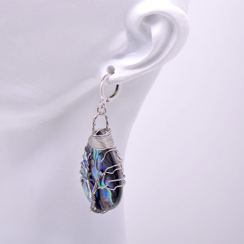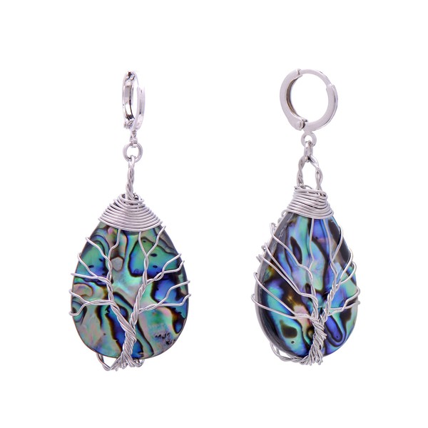 Tree of Life Hand Wrapped Iridescent Abalone Shell Teardrop Earrings for Women, Silver Wired Lever Backs