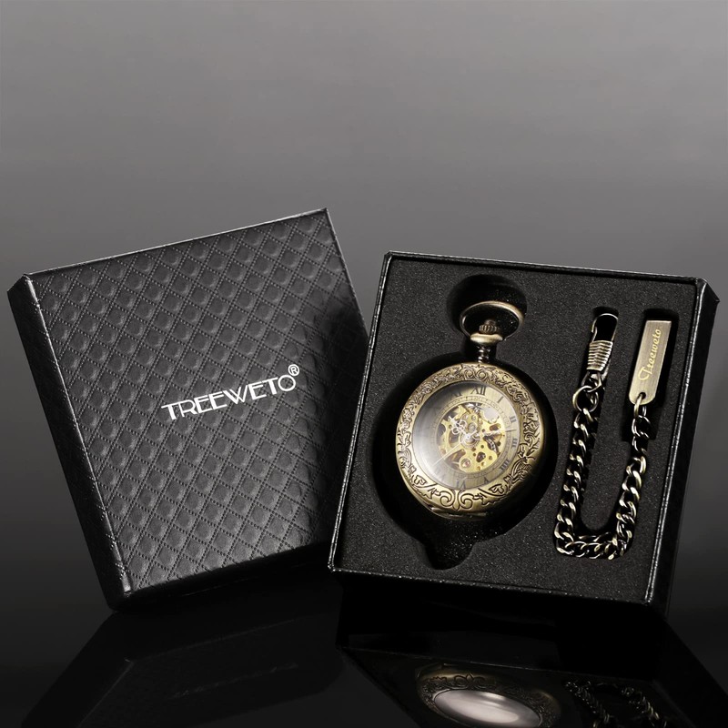 • UNIQUE PACKING: This half hunter pocket watch includes a 14 inch steel curb chain that can attach to your belt loop, and come with unique TREEWETO brand gift box.