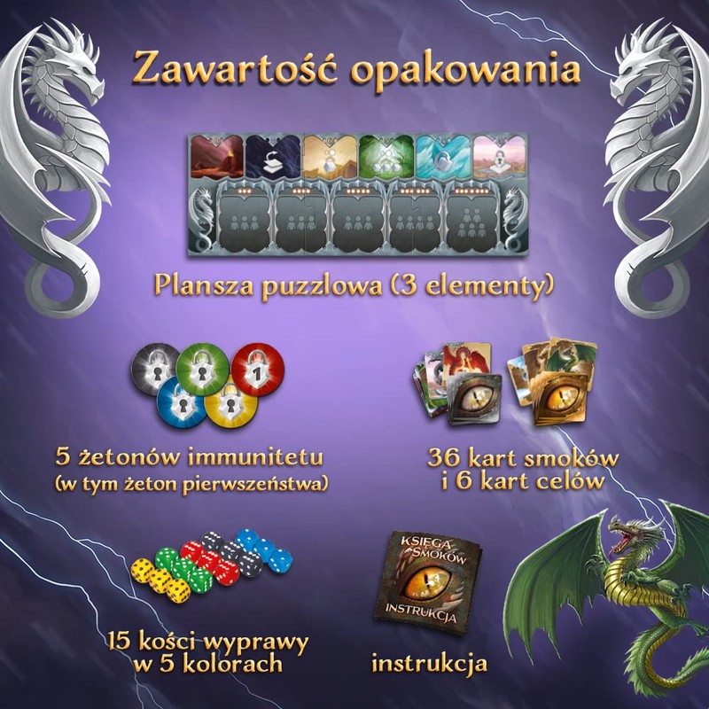 - Includes 35 dragon cards, 6 target cards, puzzle board (3 pieces), 5 immunitets (including priority ship), 15 touring bones in 5 colours and instructions (English language not guaranteed)