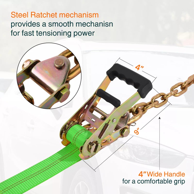 Car Tire Straps with Chain Anchors96" tie down straps with 16" heavy duty chain anchors for extra strength and more adaptable and secure tie down options to d-rings, side rails, grab hooks or stake pockets. |
