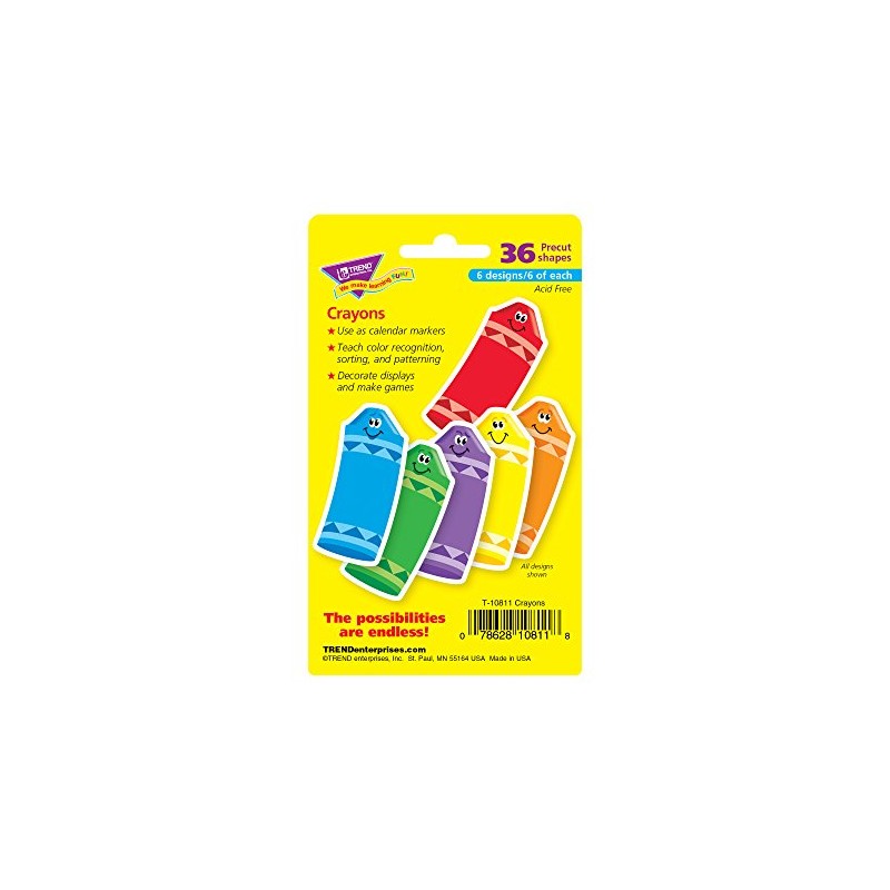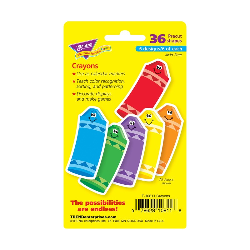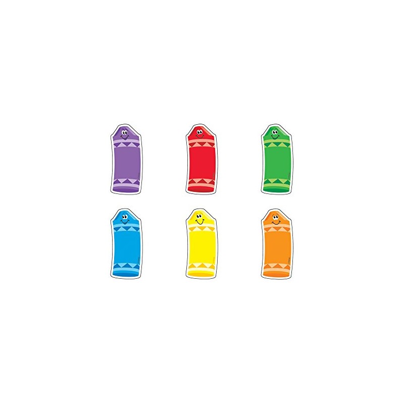 - Handy smiling crayons are precut and ready to use in green, purple, orange, blue, red, and yellow.