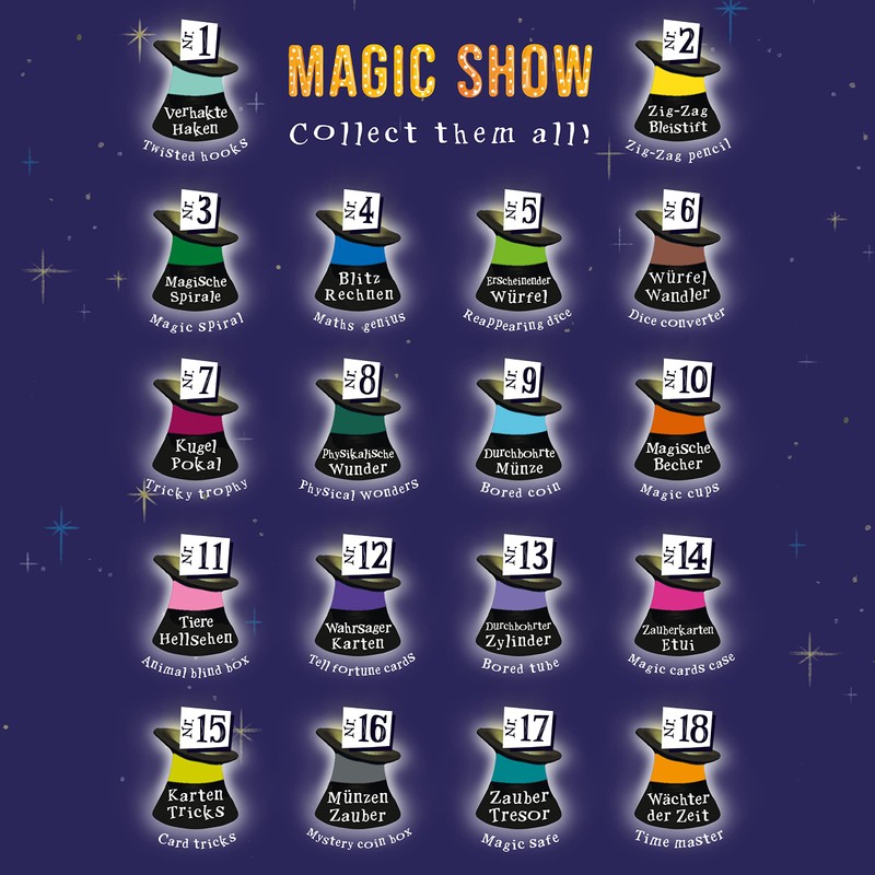 - 5 x show tickets ✓ The 18 magic tricks from TRENDHAUS contain 5 tickets with which you can invite your audience to your own little Magic Show. Stage free!