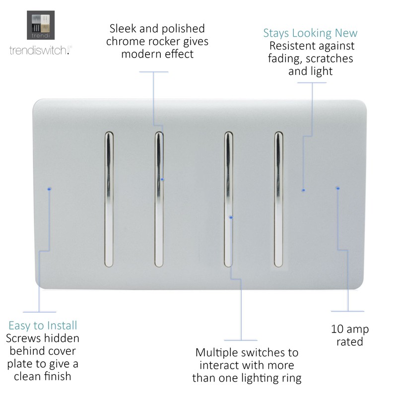 • A PLATINUM SILVER 4 GANG LIGHT SWITCH MADE FROM HIGH QUALITY FIREPROOF ABS PLASTIC: From Trendiswitch, screwless plate with a sleek and modern appearance – making decorating a breeze.