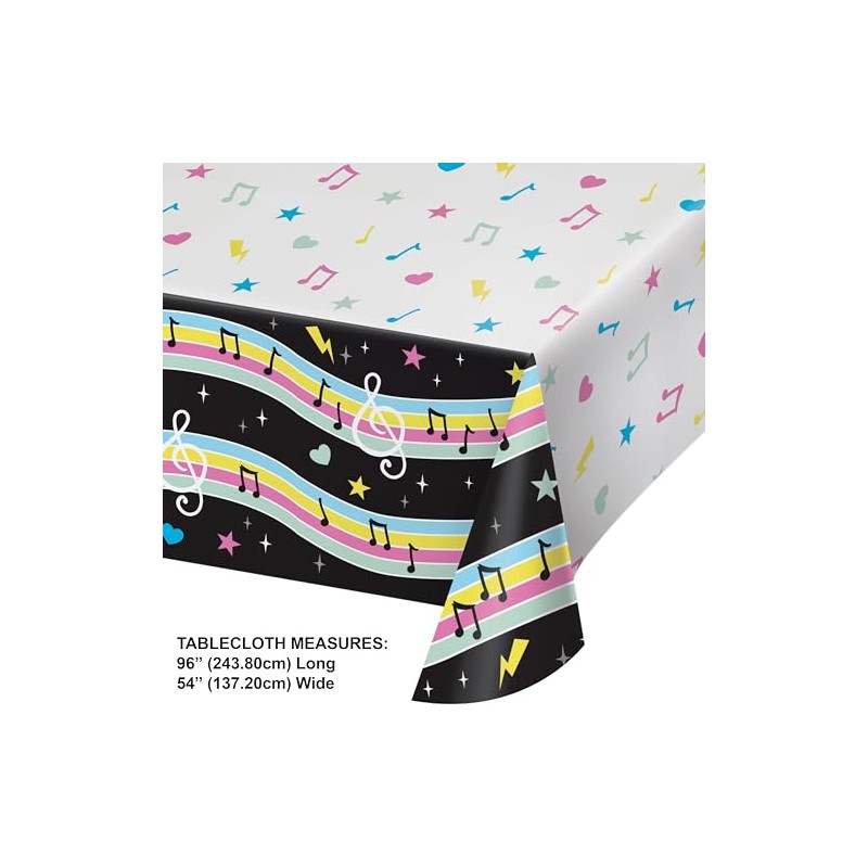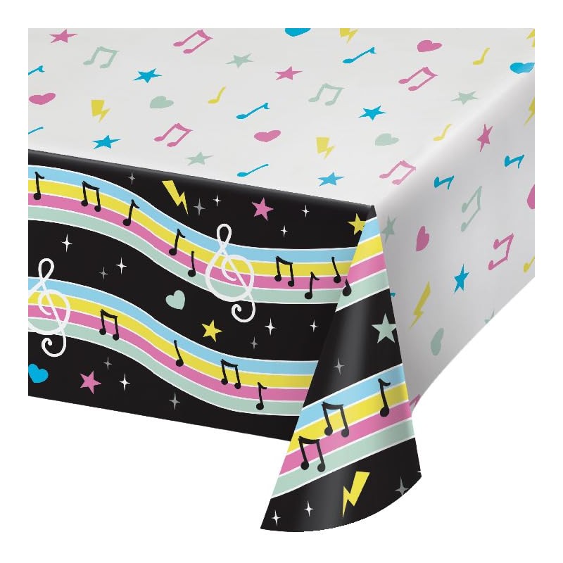 - Tablecloth features an all-over-print with music notes, hearts, starts, and lightning bolts in tones of mimosa yellow, pastel blue, and candy pink