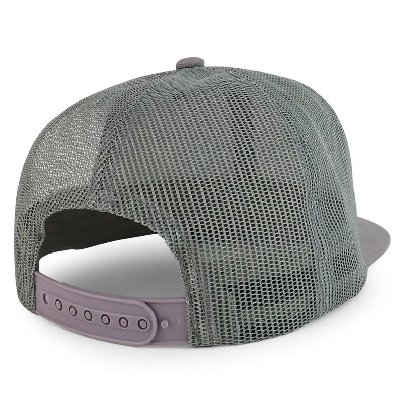 - 6 panel, mesh back, flat bill, structured crown, and sewn eyelets
