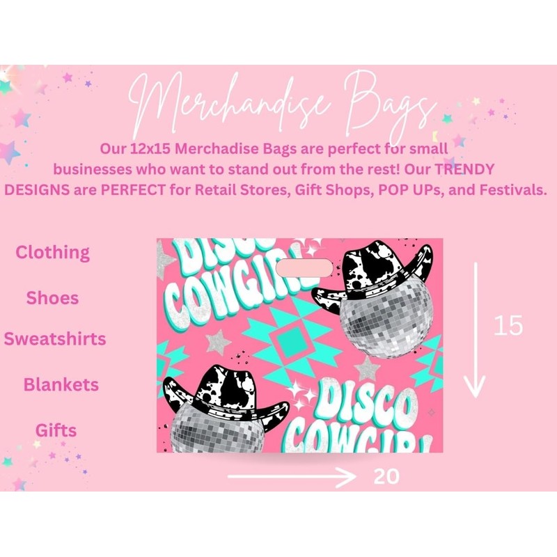 Trendy Chick Mailers - 100 pack die cut Merchandise and Shopping Bags. Perfect for Retail Stores, Boutiques, Gift Shops, and Festivals. Western, Cute and Trendy designs (Disco Cowgirl, 20x15)