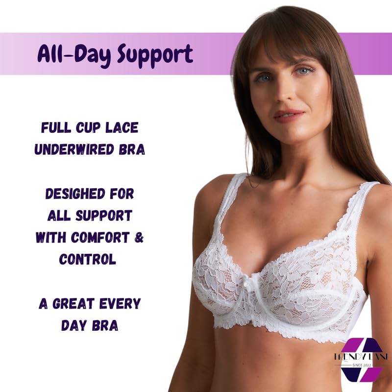 Trendy Lane Women’s Underwire Floral Lace Bra - Full Cup, Non-Padded, Soft Cups & Adjustable Straps - Everyday Comfortable Fit in Black & White (White, 36DD)
