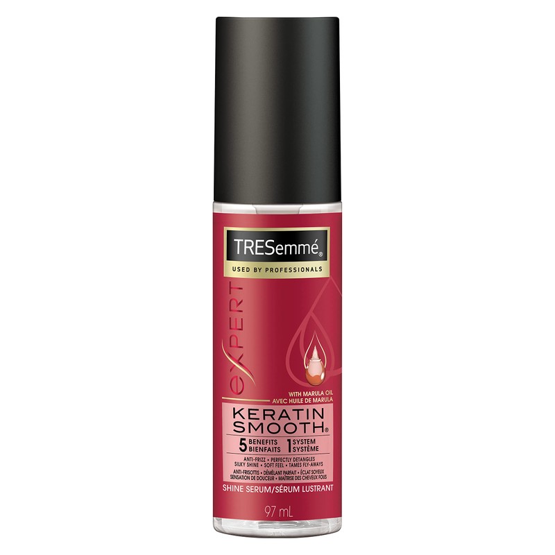 - The TRESemmé Keratin Infusing Smoothing Serum helps to eliminate frizz and seals in shine for a polished, smooth look.