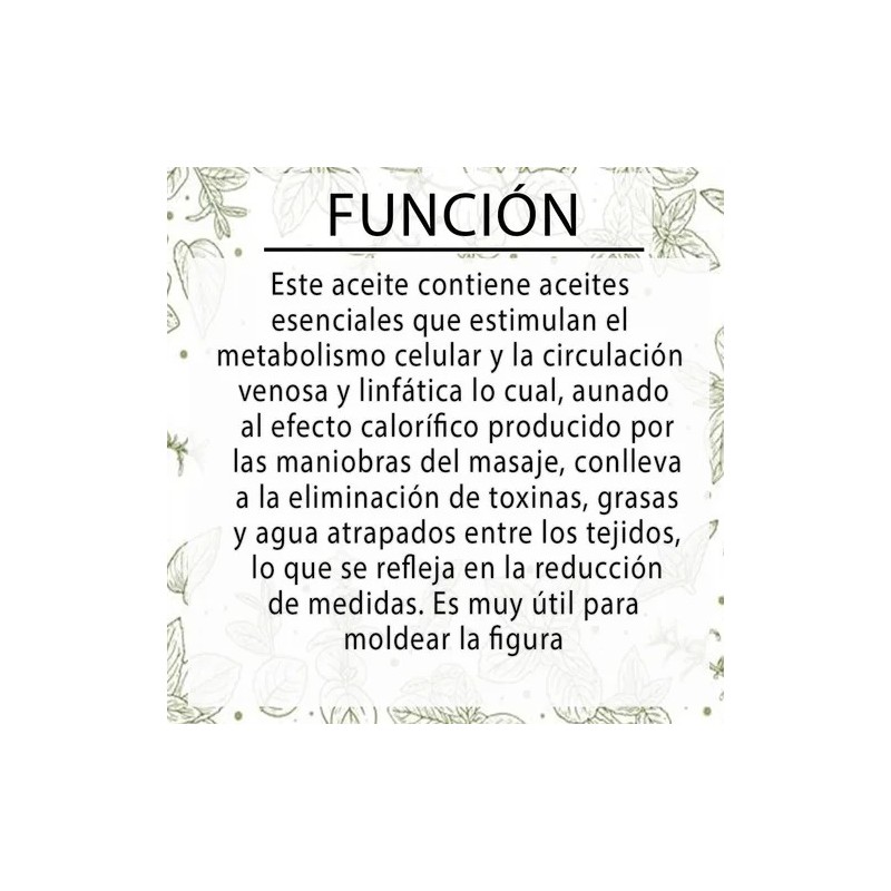 Mezcla de Aceites conocidos por suacción reafirmante y tonificante. También activa la microcirculación y el flujo linfático,generando una gran firmeza y elasticidad en la piel.