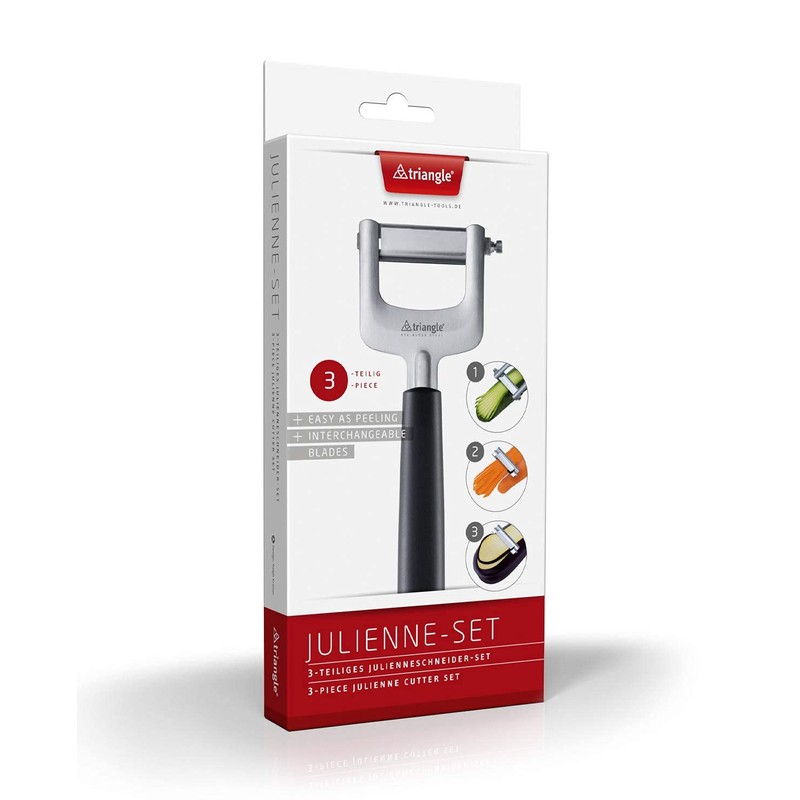 - Details: 3-in-1 with interchangeable blade system: 3 x 3 mm strips, 3 x 6 mm strips and 3 mm thin slices of carrots, courgettes, potatoes and much more. As easy as peeling. The special blade shape always ensures perfect separated julienne.