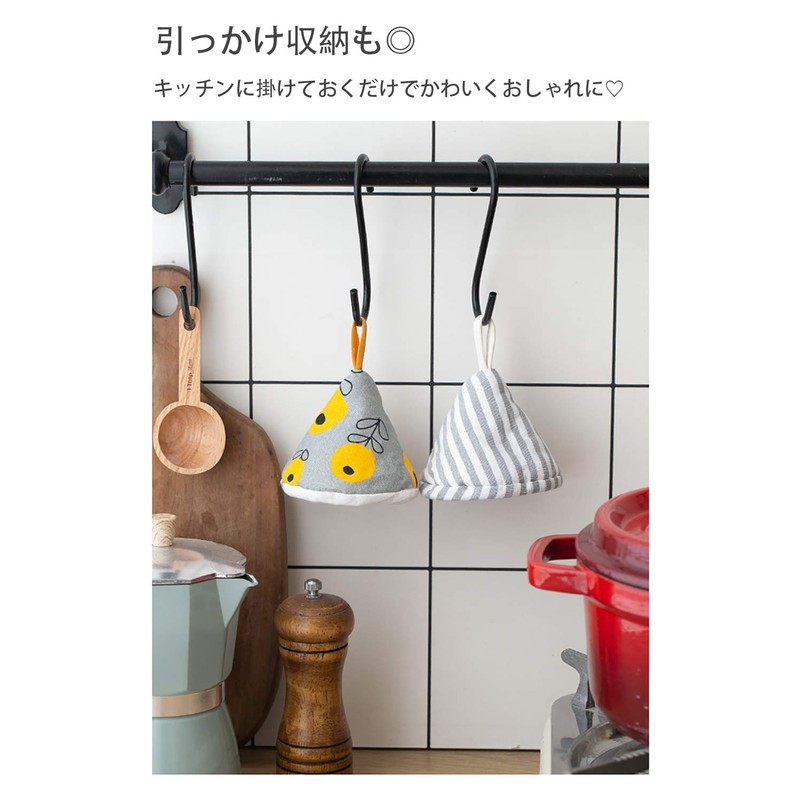 - Heat resistant mittens (pot holders) indispensable for everyday cooking. A triangular potholder that looks like a hat. A convenient item to use when opening lids such as pots, yakans, and pots. It also has excellent interior decor, so you will want to decorate it without needing to be